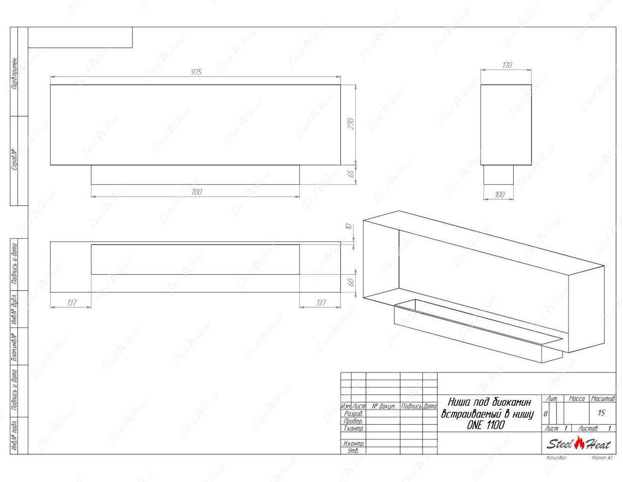 Встраиваемый Биокамин SteelHeat ONE-H 1100 предназначен для встраивания в глухие ниши из гипсокартона, кирпича, пеноблоков, бетона.
