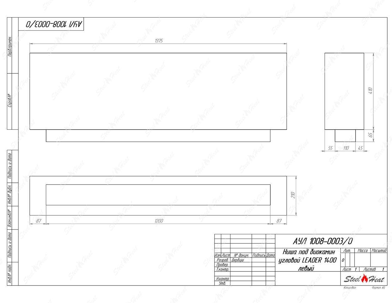 Встраиваемый Биокамин угловой SteelHeat Leader 1400 левый предназначен для встраивания в глухие ниши из гипсокартона, кирпича, пеноблоков, бетона.