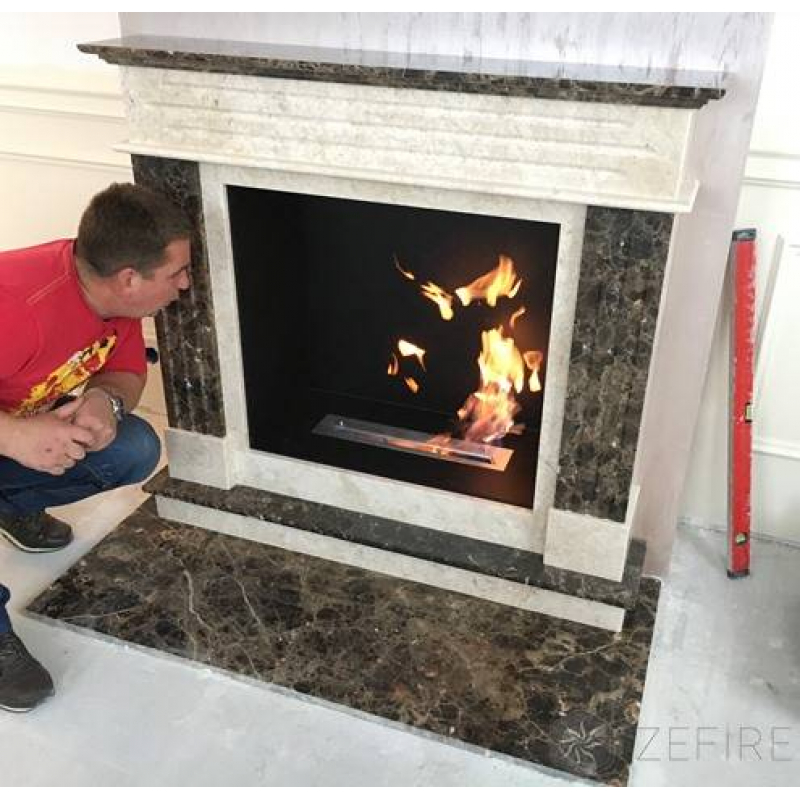 Очаг – это емкость куда заливается жидкое топливо. Емкость внутри заполняется керамическим материалом, который впитывает биотопливо, и в случае опрокидывания камина топливо не разливается. За счет этого конструкция стала полностью пожаробезопасной. Очаг встраивается в корпус из стали, который окрашивается специальной термостойкой краской, или же в заранее подготовленную нишу, изготовленную из негорючих материалов.