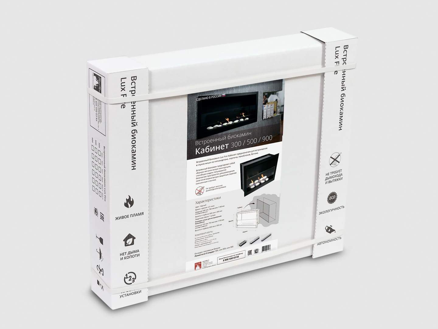 Биокамин оснащен качественным топливным блоком Lux Fire 500 М и закрепленным на 4 дистанционных держателях защитным стеклом.