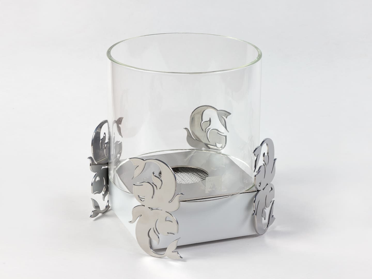 Представляет собой металлический внешний корпус с встроенным топливным блоком Lux Fire 150-2 на декоративных ножках в виде Рыб. Огонь ограничивается стеклянным закаленным плафоном диаметром 180 мм.Среднее время горения 3 часа
