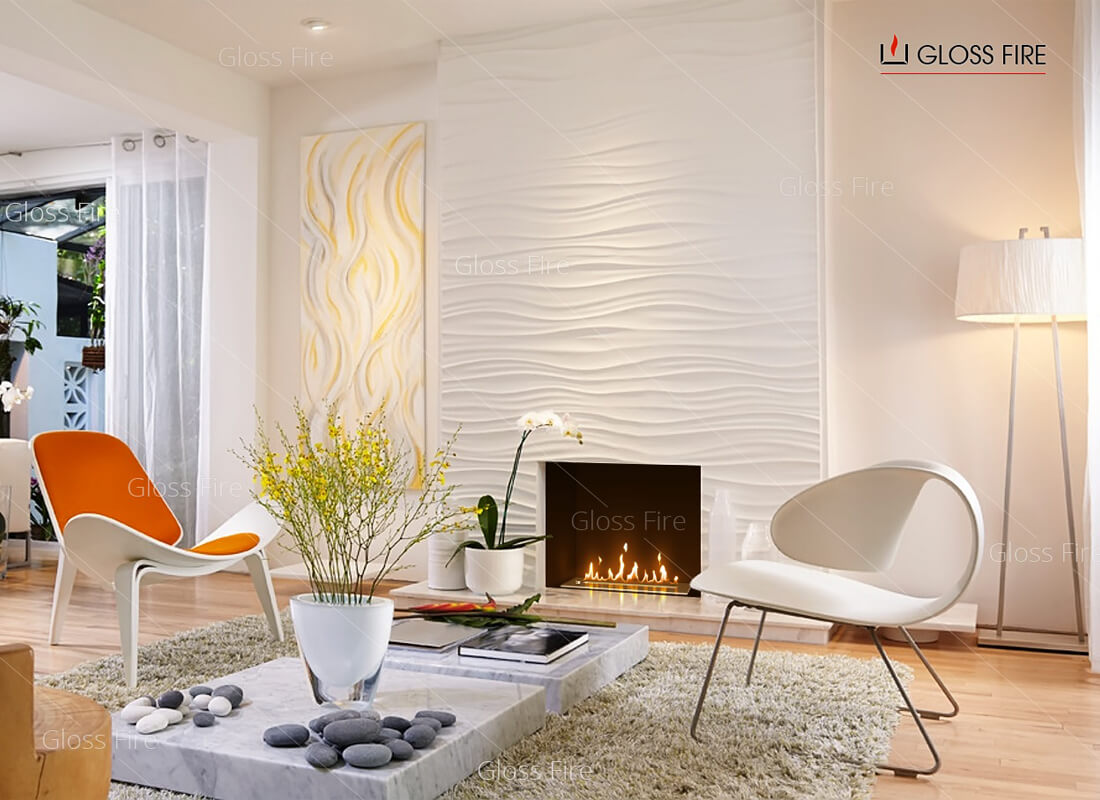 Очаг – это емкость куда заливается жидкое топливо. Емкость внутри заполняется керамическим материалом, который впитывает биотопливо, и в случае опрокидывания камина топливо не разливается. За счет этого конструкция стала полностью пожаробезопасной. Очаг встраивается в корпус из стали, который окрашивается специальной термостойкой краской, или же в заранее подготовленную нишу, изготовленную из негорючих материалов.