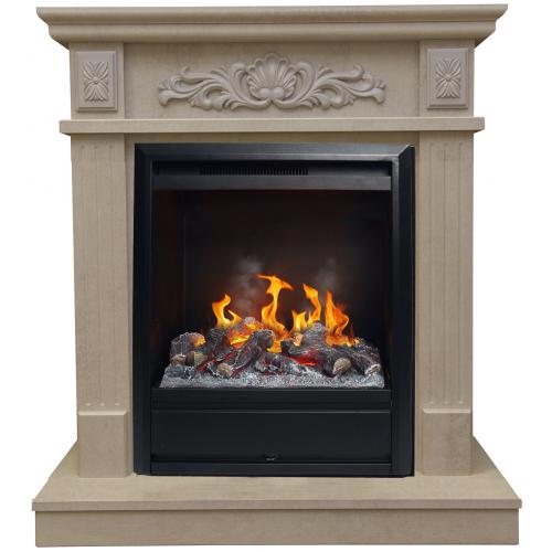 Основа портала выполнена с использованием современного материала МДФ, который по своей структурой схож с натуральной древесиной. Этот материал по прочностным характеристикам ей уступает мало, но значительно превосходит по устойчивости к перепадам температуры и влажности. С учетом использования в конструкции парового очага этот фактор является очень важным. Дополнительную защиту основе придает слой натурального шпона. Также за счет оформления шпон выполняет дополнительно и декоративную функцию. Очаг каминокомплекта выполнен в строгом минималистическом стиле. Его черная расцветка отлично контрастирует со светлым тоном портала. Внутрь встроен Муляж дров и прогоревших углей, который по оформлению максимальной схож с настоящими. Защитное стекло в очаге отсутствует, благодаря чему ничто не мешает наслаждаться красотой горящего пламени.
