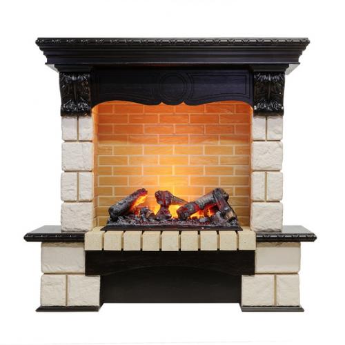 <Портал предлагаемого камина выполнен в стиле кантри. Он имеет Д-образную форму, а в конструкции четко выделены зона очага и основание. Очаг обрамляют каменные стенки, оформленные в верхней части резными консолями, в дизайне которых прослеживаются растительные мотивы. Консоли используются для визуальной поддержки массивной каминной крышки, выступающей немного вперед. Кромка крышки имеет ступенчатую конструкцию и украшена резным фризом. В верхней части зоны очага имеется вставка, украшенная резьбой. Внутренние стенки оформлены под кирпич. Основание камина представляет собой две колонны, между которыми расположена арочная вставка из МДФ. В полученную нишу при желании можно сложить настоящие Муляж дров. По краям основание оформлено массивными полочками, кромка которых декорирована подобно каминной крышке. Непосредственно зона очага облицована камнем.Очаг комплекта представляет собой широкую вставку, механизм которой утоплен в специальную нишу. Верхняя часть представляет собой декоративный Муляж дров и углей. Специальная технология окрашивания и высокая детализация позволили добиться максимального сходства изделия с настоящим дровяным камином. При работе системы имитации пламени создается эффект тления углей.