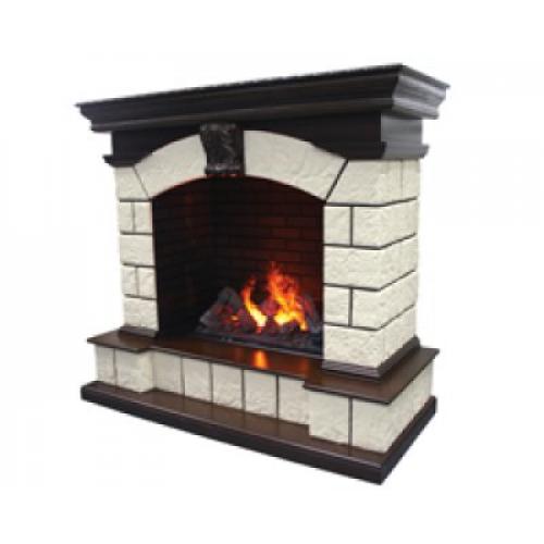 Боковые грани портала и его основа облицованы материалом, по цвету и фактуре имитирующему натуральный камень цвета «Шампань». Этот цвет отличается с расцветкой темного дуба, в котором выполнены декоративные вставки. Отличительной особенностью портала является мощная каминная полка, которая снизу оформлена декоративной вставкой арочного типа, выполненного из того же материала. Уровень топки оформлен деревянными полками. Также в конструкции присутствует мощное основание, которое придает камину более солидный вид.
