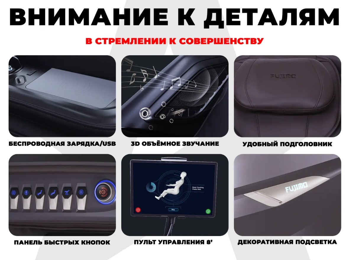 Вытягивание позвоночника- это автоматическая программа, во время которой кресло складывается, массажные подушки бережно захватывают голеностоп, плечи и руки, кресло выполняет потягивающие движения, при этом совершая роликовый массаж вдоль позвоночника., Запоминание программ - при ручной настройке массажных функций, их можно сохранить в компьютере кресла., Музыка - подключение к креслу по Bluetoth для прослушивания Вашей любой музыки во время массажа., Невесомость (Zero-G) - кресло принимает положение, при котором ноги находятся выше уровня головы. При таком положении происходит максимальное расслабление и прорабатывание более глубоких тканей роликовым массажем., Прогревание - с помощью инфракрасного прогрева происходит расслабление мышечных тканей, за счёт чего массаж становится ещё более эффективен., Раскачивание - во время массажа, кресло совершает плавные покачивающие движения., Регулировка под рост - с помощью этой функции кресло подойдёт людям с разным ростом., Светотерапия - основанна на применении световых лучей как имитации солнечного света., Сканирование - перед началом сеанса, кресло выявляет отличительные особенности пользователя и проблемные зоны., Слайдер - благодаря данной функции устройство можно ставить практически вплотную к стене и не беспокоиться, что при начале массажа, спинка кресла упрётся в стенку., Управление со смартфона - скачиваете приложение и управляете креслом прямо с телефона |