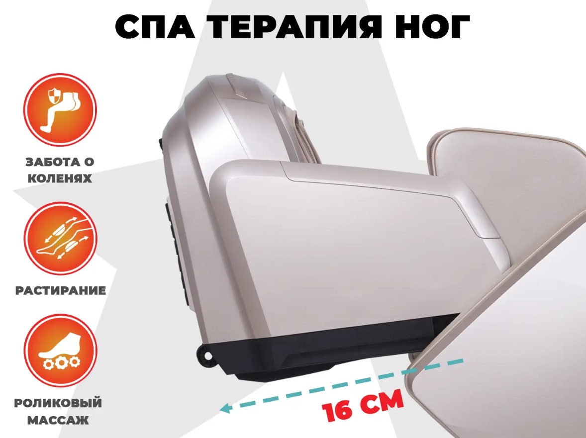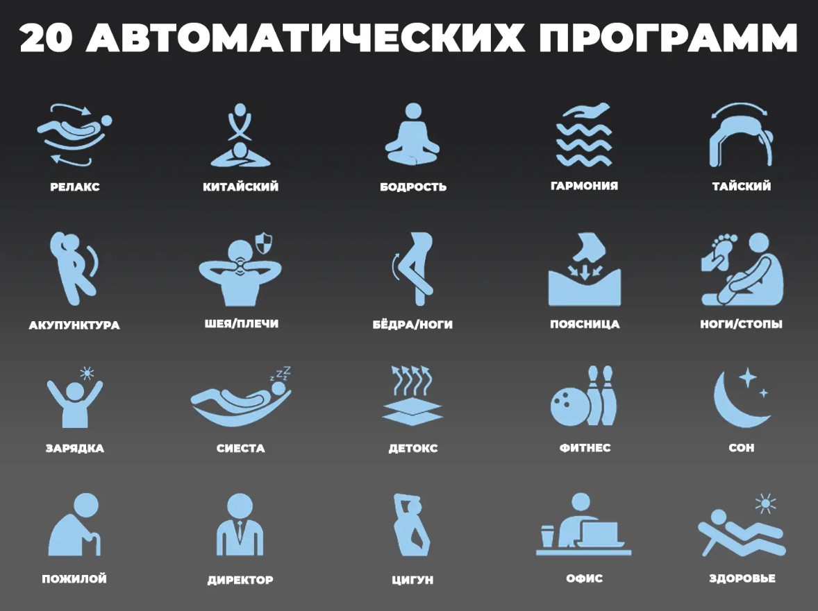 Вытягивание позвоночника- это автоматическая программа, во время которой кресло складывается, массажные подушки бережно захватывают голеностоп, плечи и руки, кресло выполняет потягивающие движения, при этом совершая роликовый массаж вдоль позвоночника., Запоминание программ - при ручной настройке массажных функций, их можно сохранить в компьютере кресла., Музыка - подключение к креслу по Bluetoth для прослушивания Вашей любой музыки во время массажа., Невесомость (Zero-G) - кресло принимает положение, при котором ноги находятся выше уровня головы. При таком положении происходит максимальное расслабление и прорабатывание более глубоких тканей роликовым массажем., Прогревание - с помощью инфракрасного прогрева происходит расслабление мышечных тканей, за счёт чего массаж становится ещё более эффективен., Раскачивание - во время массажа, кресло совершает плавные покачивающие движения., Регулировка под рост - с помощью этой функции кресло подойдёт людям с разным ростом., Светотерапия - основанна на применении световых лучей как имитации солнечного света., Сканирование - перед началом сеанса, кресло выявляет отличительные особенности пользователя и проблемные зоны., Слайдер - благодаря данной функции устройство можно ставить практически вплотную к стене и не беспокоиться, что при начале массажа, спинка кресла упрётся в стенку., Управление со смартфона - скачиваете приложение и управляете креслом прямо с телефона |